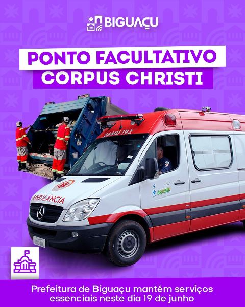 A Prefeitura de Biguaçu informa que manterá os serviços essenciais neste dia 19 de junho, ponto facultativo de Corpus Christi. Com isso, serão assegurados à população os atendimentos de urgência e emergência em saúde e a continuidade da coleta de resíduos.